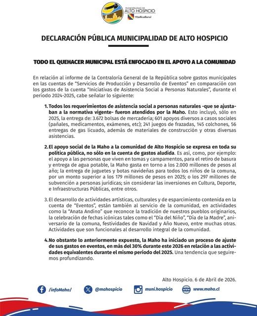 Declaración pública municipalidad de Alto Hospicio todo el quehacer municipal está enfocado en el apoyo a la comunidad.