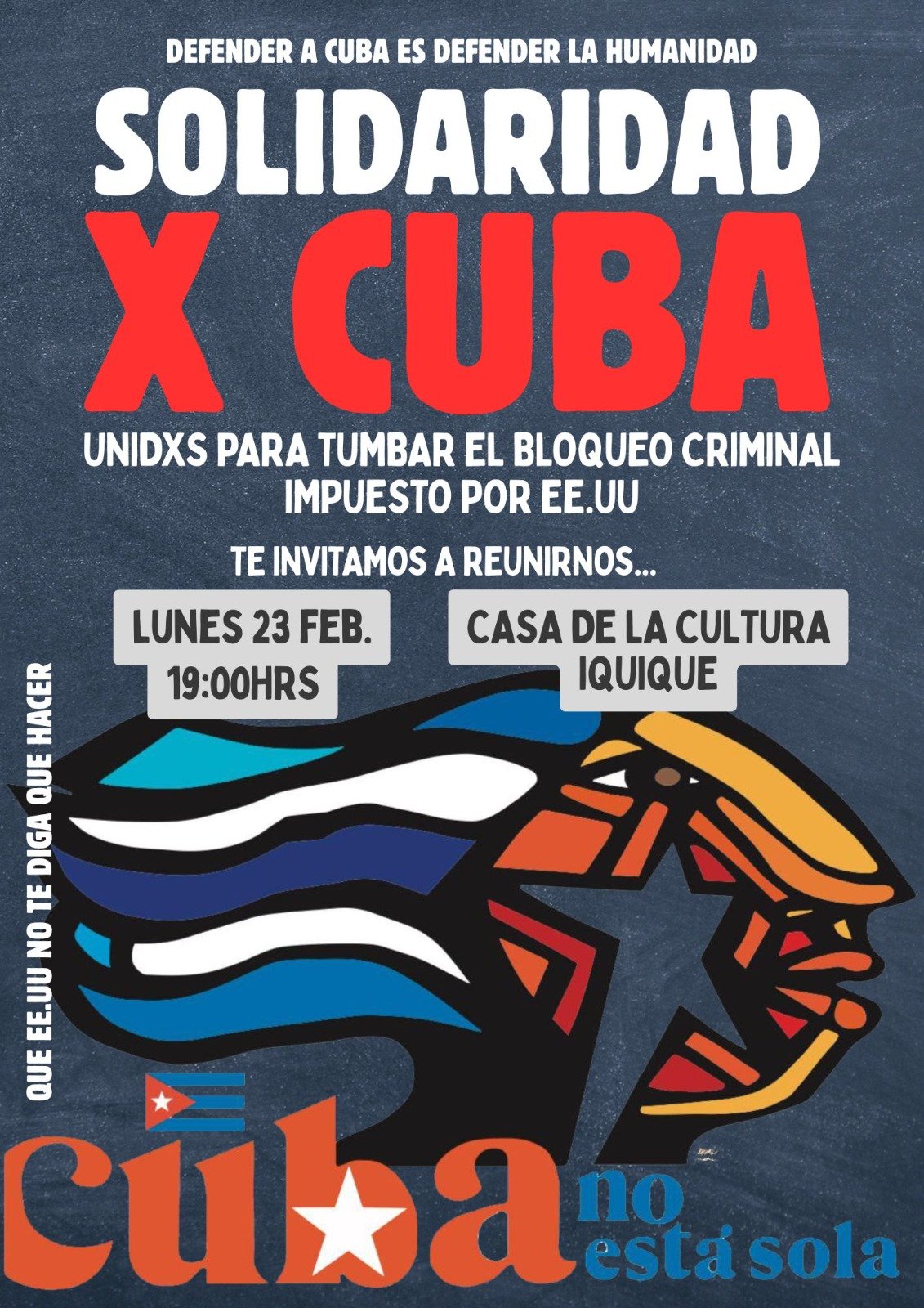 En ese contexto, -y bajo la premisa que defender a Cuba, es defender a la Humanidad”-, es que este lunes 23 de febrero, se realizará un nuevo encuentro, a las 19.00 horas, en la Casa Municipal de la Cultura de Iquique.