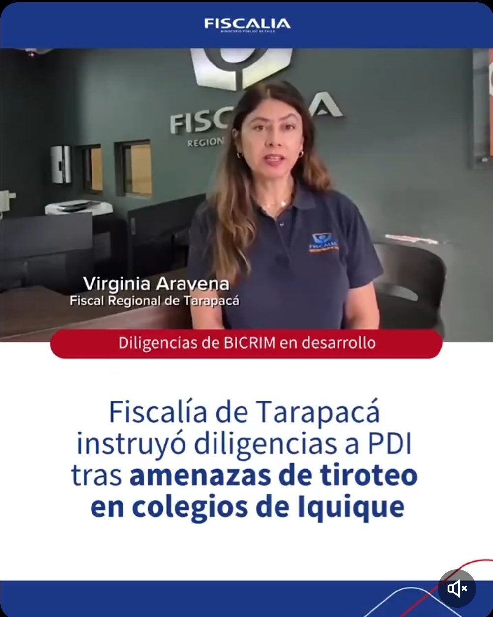La Fiscal Regional de Tarapacá, Virginia Aravena, explicó que “el día de ayer 8 de abril se recibieron en la Fiscalía al menos tres denuncias de distintos colegios, en los cuales indicaban que en el sector de los baños de los colegios habían amenazas de tiroteo”.